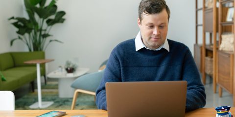Man using laptop at home for flight price comparison