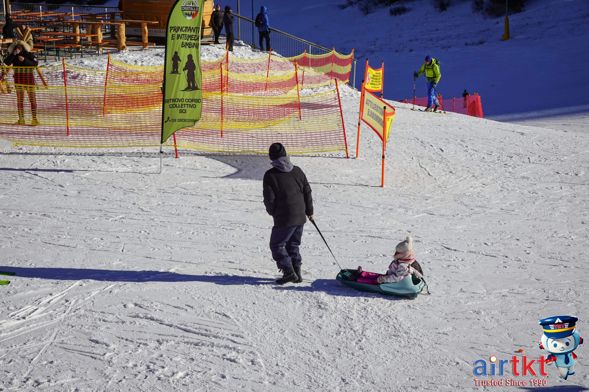 Family enjoying winter activities in a snowy mountain destination